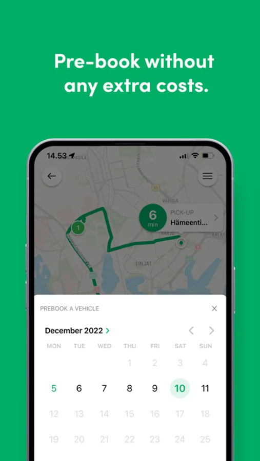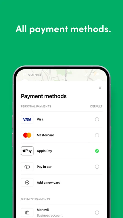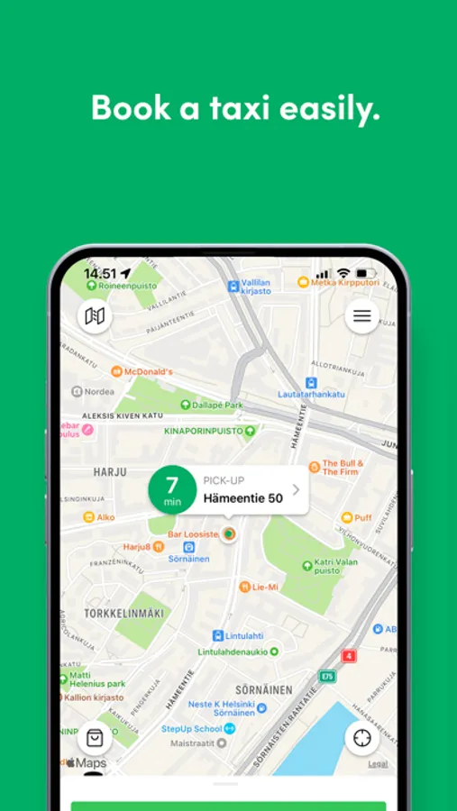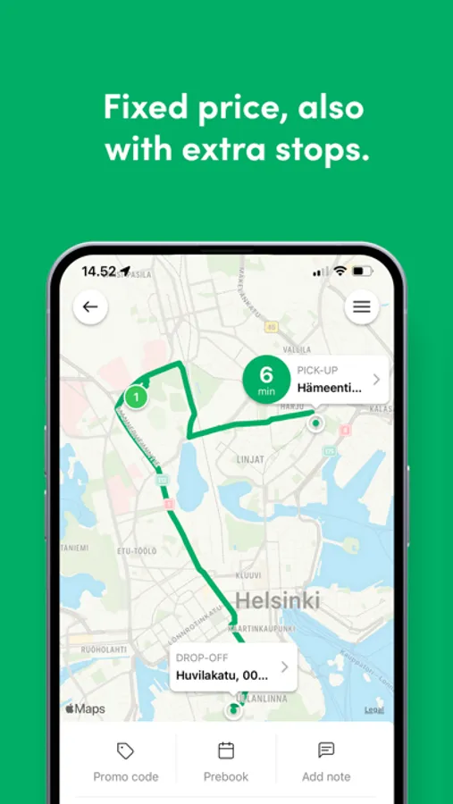 You can book a taxi straight away or prebook a ride for a later time and date. Booking is always free of charge and you will see a fixed price before the ride. You can pay for your ride using a card, using Apple Pay or after your ride in the car.