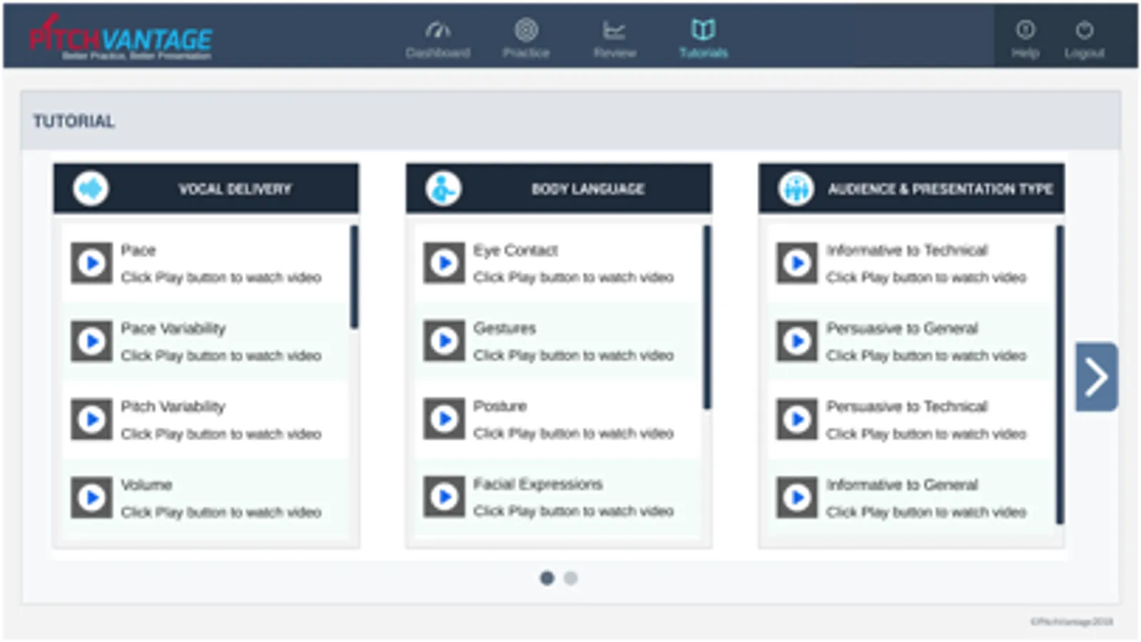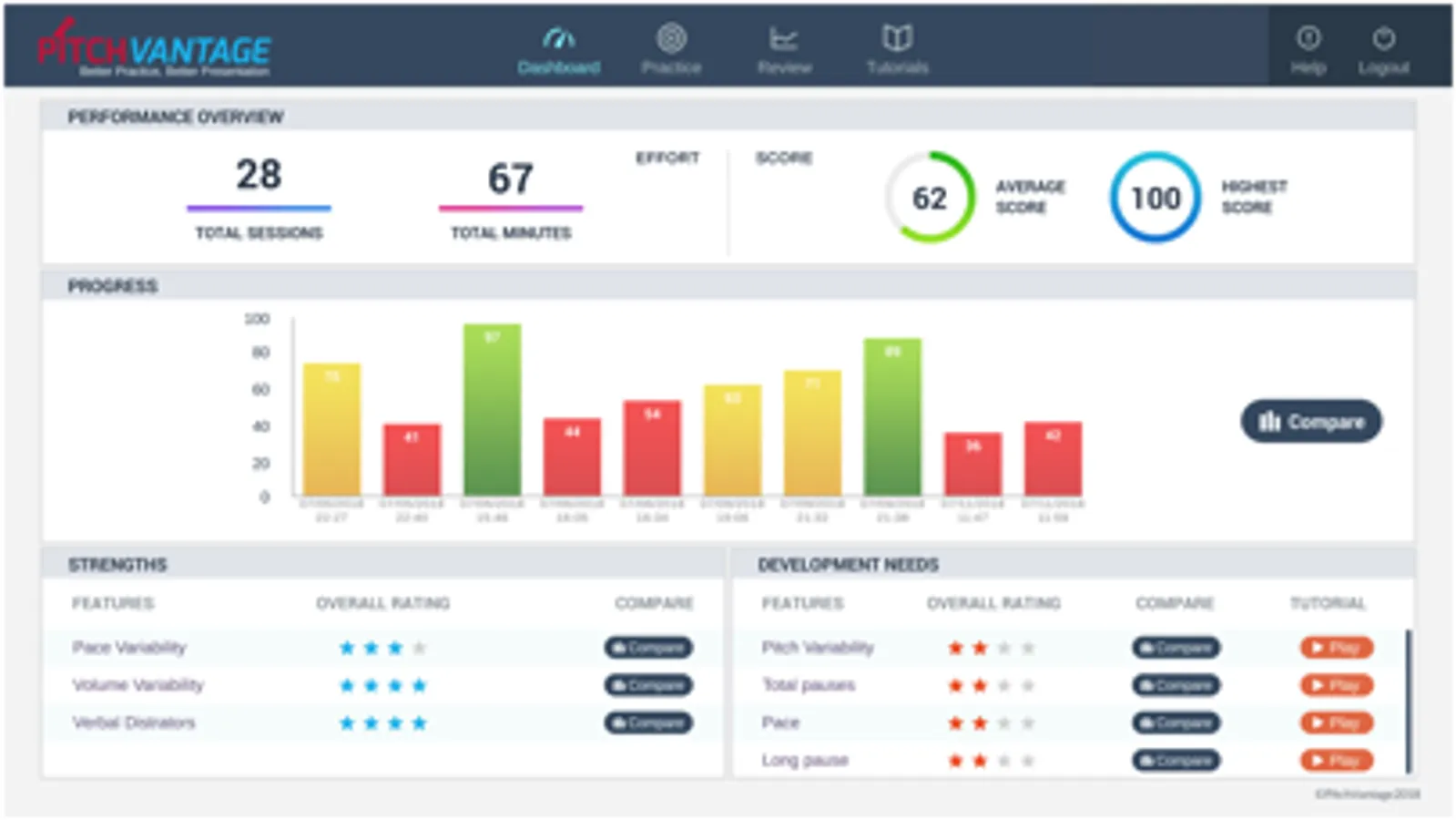 Receive instant feedback on your presentation skills with PitchVantage. PitchVantage analyzes recordings to identify areas of improvement and gives coaching to make you a stronger presenter.
