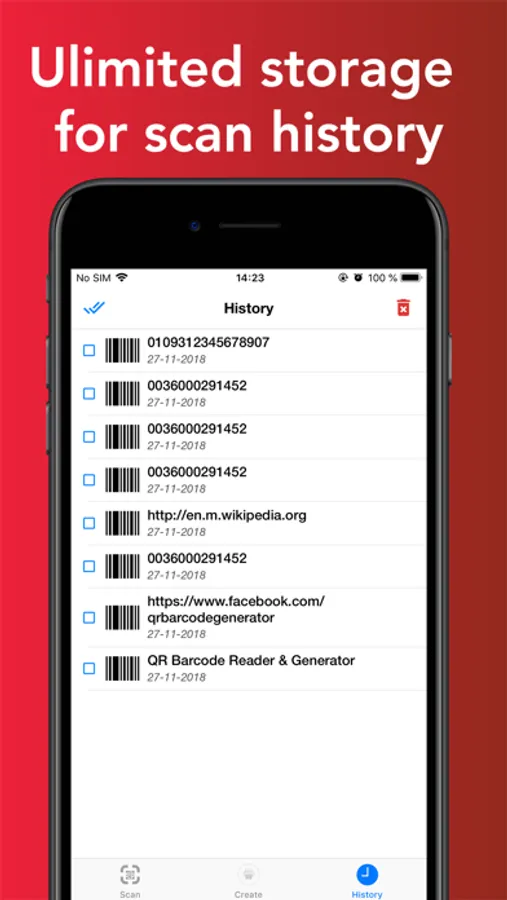 Unlike most bar codes & qr scanner apps, our app is designed to keep a history of your scanned data just in case you needed in the future. And there is unlimited storage for your history, making it perfect for users that frequently scan qr codes and barcodes.