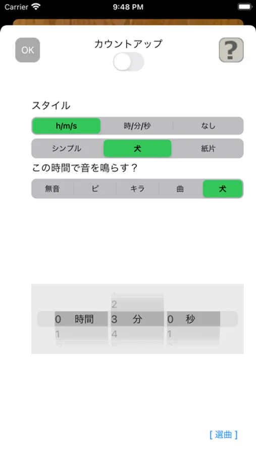 設定画面でスイッチを「カウントアップ」にすると、時間が加算される方向でタイマーが動きます。