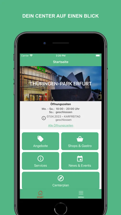 • Der interaktive Centerplan hilft Ihnen beim Finden der Shops und Gastrobetriebe im Center und zeigt Ihnen auch gleich alle Öffnungszeiten und Kontaktdaten auf einen Klick.