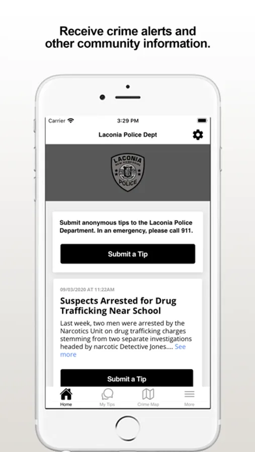 The Laconia PD app provides citizens the ability to submit anonymous tips to the Laconia, NH Police Department. The app also displays agency crime alerts, crime map and other organization web and social media content.
