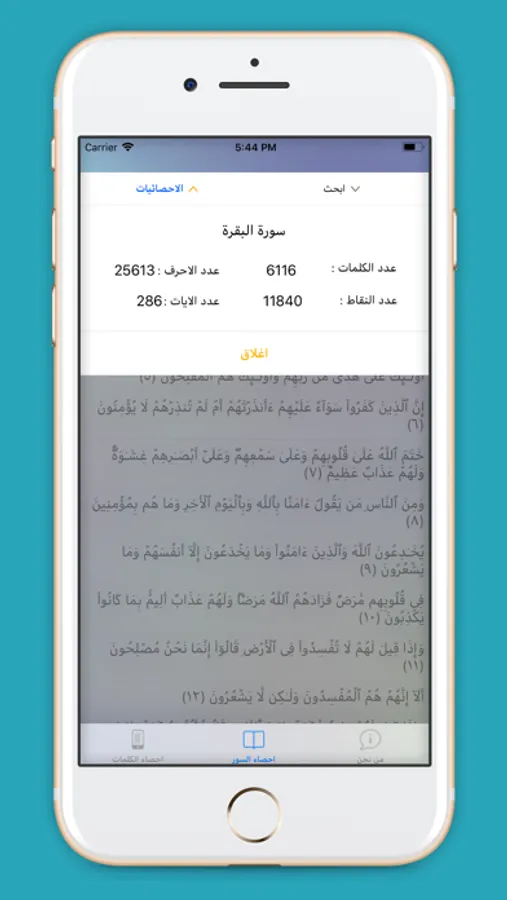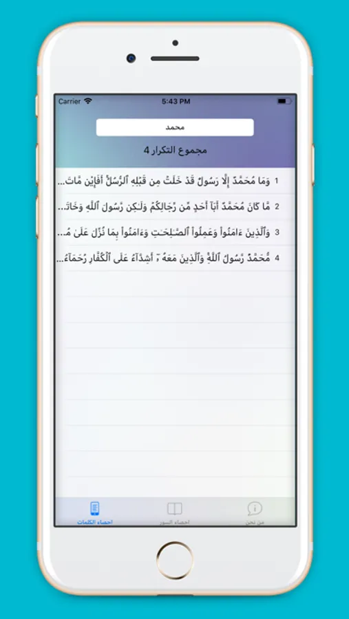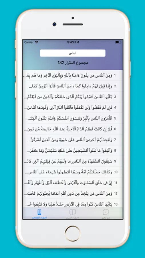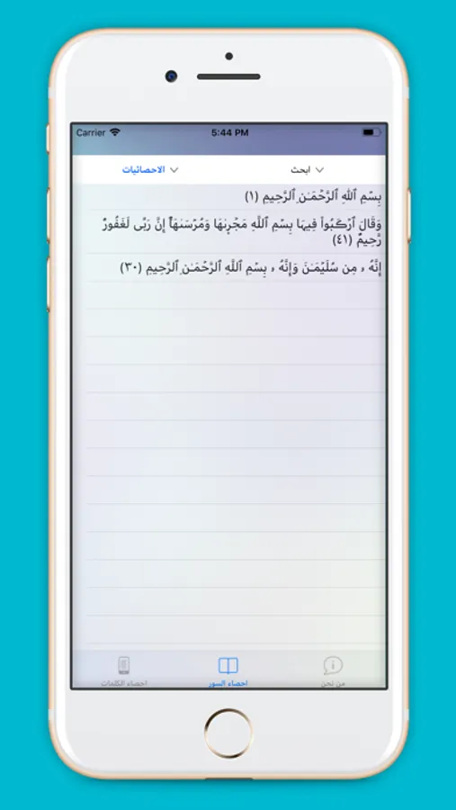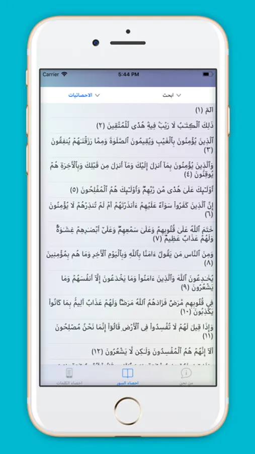 تستطيع البحث عن احصائيات الايات منفردة في كل سورة من حيث : اسم السورة , رقم الاية , رقم السورة , عدد الحروف , عدد الكلمات , عدد النقاط , الحروف المميزة , رقم الجزء , رقم الصفحة .