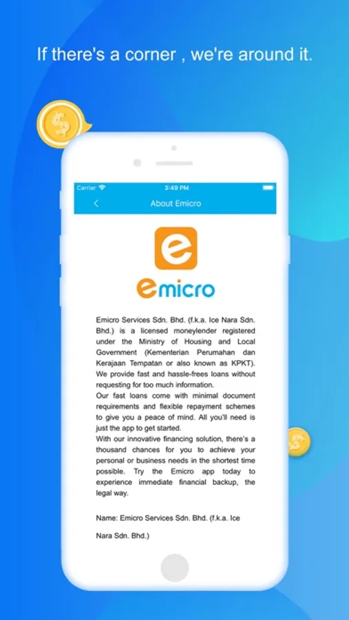 Emicro Services Sdn. Bhd. is a licensed moneylender registered under the Ministry of Housing and Local Government (Kementerian Perumahan dan Kerajaan Tempatan or also known as KPKT). And we are also certified by Our Shariah Advisors for Tawarruq Emicro i-Financing Financing Products that empower financial services with fintech solutions.