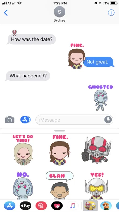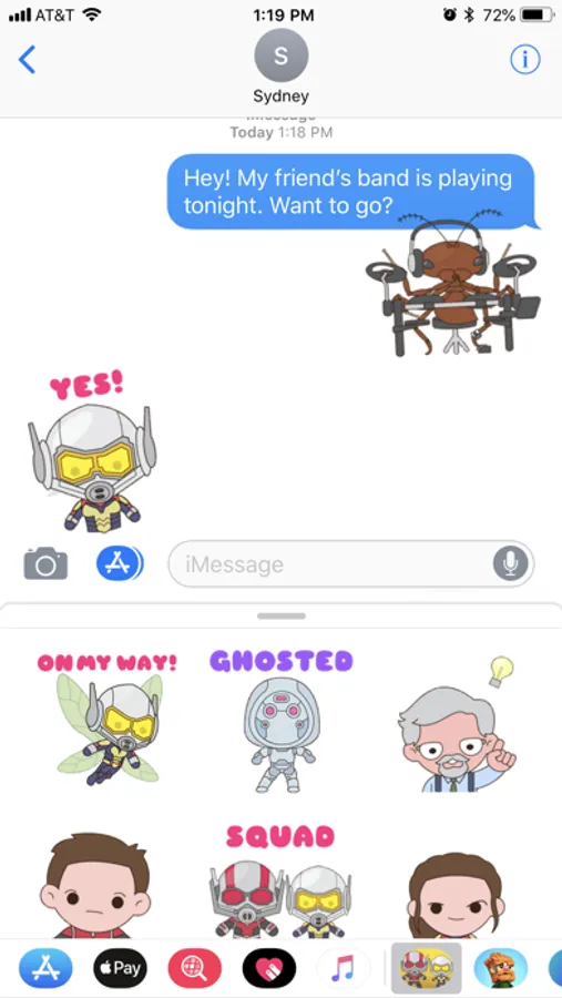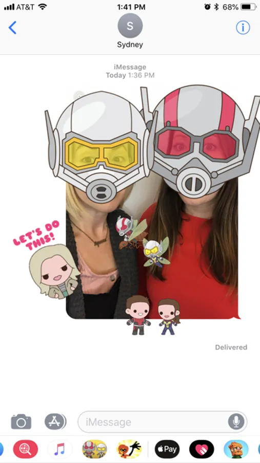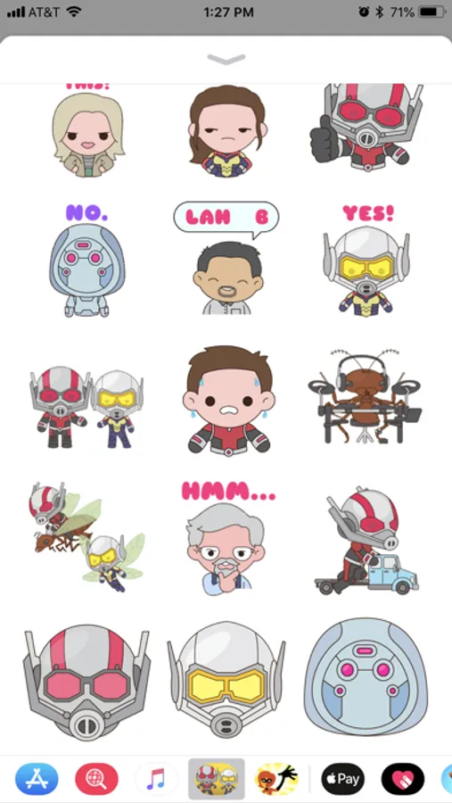 Real heroes. Not actual size. Make your iMessages bigger than ever with this pack of 24 larger-than-life Marvel Studios’ Ant-Man and The Wasp stickers. Download these fun-sized animated stickers including Ant-Man, The Wasp, Ghost, Hank Pym, Janet Van Dyne and more.