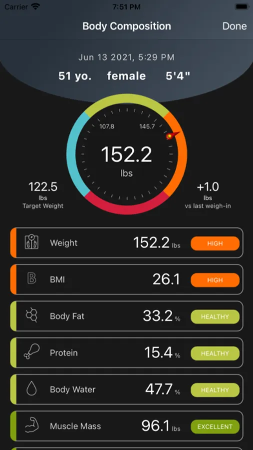 * Easy logging of 13 key body composition data, i.e. weight, ideal weight, BMI, body fat, protein, body water, muscle mass, bone mass, visceral fat, BMR, obesity degree, metabolic age, and lean muscle mass