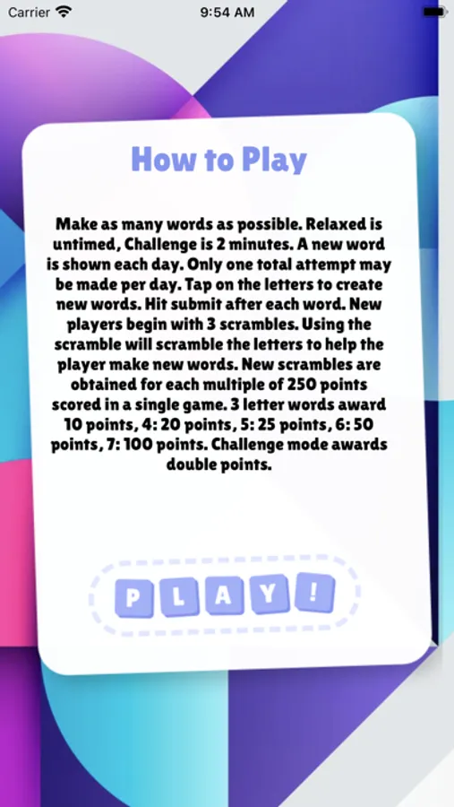 Each day receive a new word. Take the letters and scramble them around to create as many words as possible. The more you make, the more points you earn. When you decide to play in Challenge Mode, you will earn bonus points. In either mode, you will earn scrambles with every 250 points you score. The FREE scrambles roll over every day and never expire. The scrambles can spark words you hadn’t thought of.