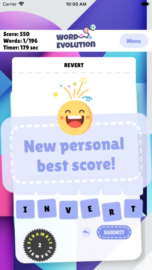 With Word Evolution, you can play in Relax Mode (Untimed)or Challenge Mode( 2-minute play).