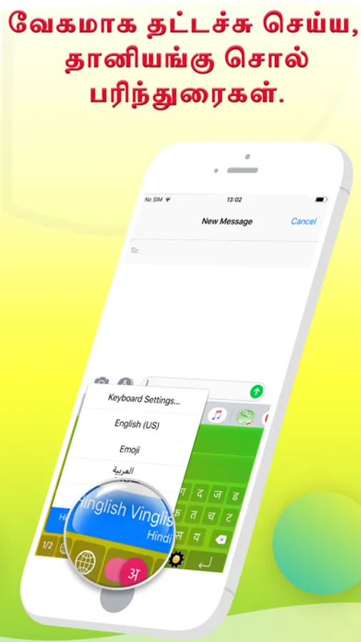 Now finally open any of the WhatsApp,Facebook,Email,Notes,Twitter, sms app, and long press the Globe icon from the default keyboard, now choose the Tamilini - Tamil Keyboard Option.