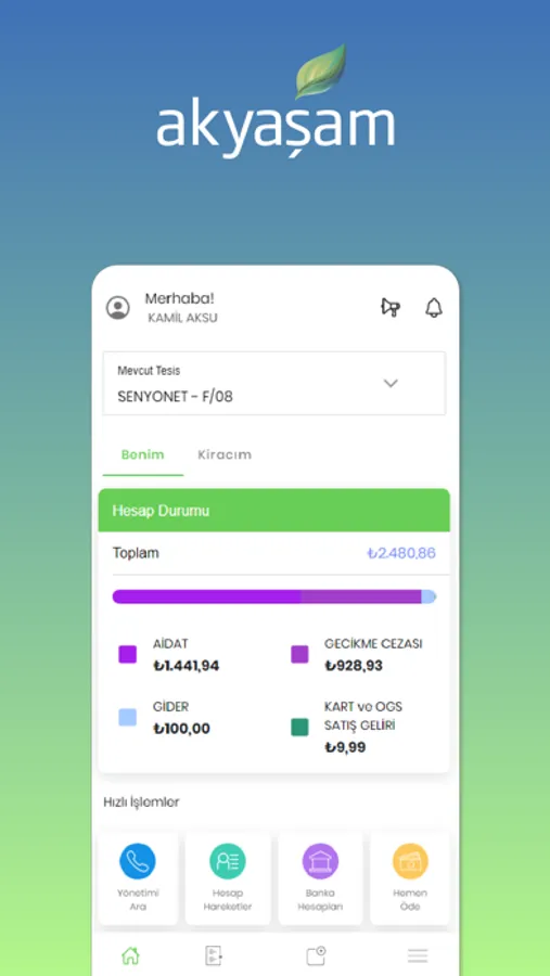 Akyaşam Yönetim Hizmetleri Site, Ofis ve Avm Sakinleri mobil uygulaması üzerinden yapabileceğiniz işlemler;