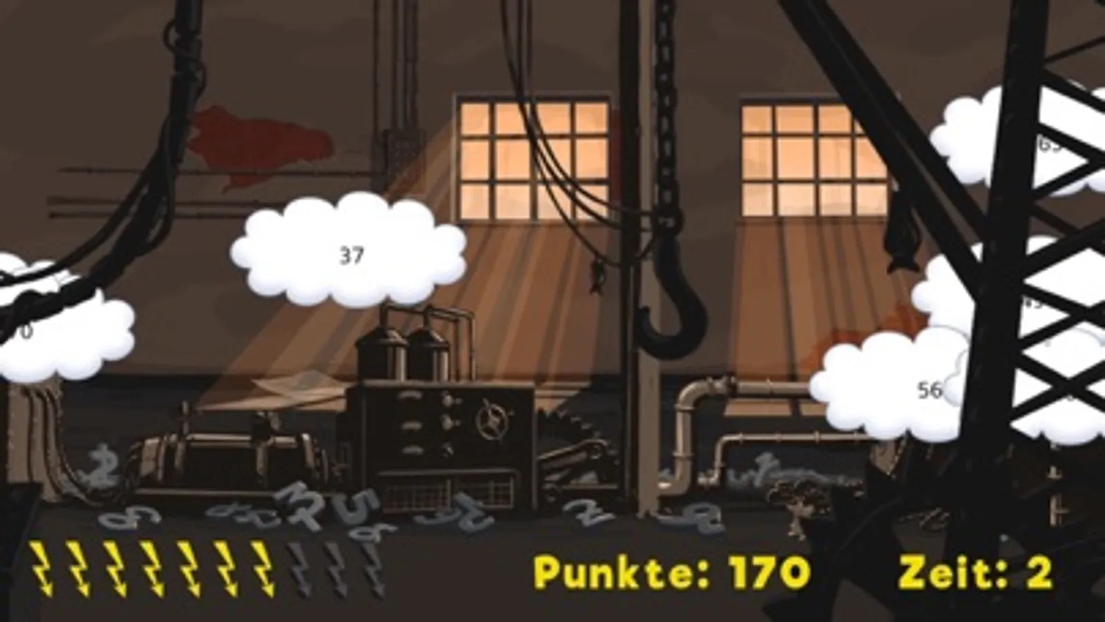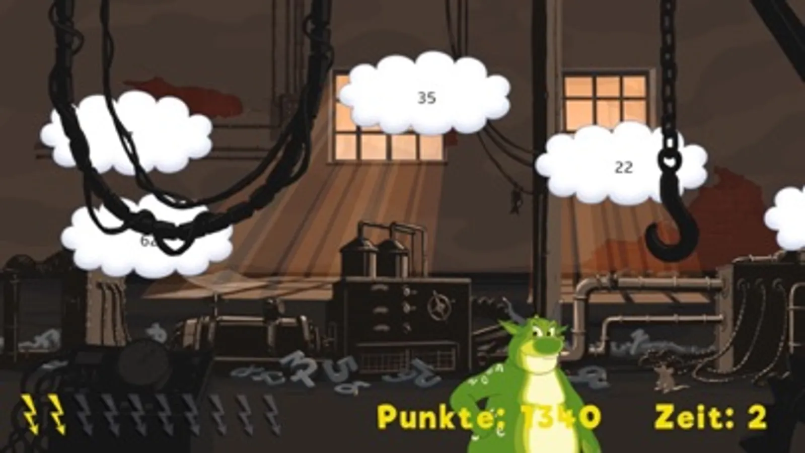 In drei aufeinanderfolgenden Runden blitzt du möglichst viele Zahlenwolken mit Zahlen aus der einmal ausgewählten Einmaleins-Reihe. Aber Vorsicht: Wenn du eine Zahl blitzt, die nicht in deiner Einmaleins-Reihe vorkommt, gibt es Minuspunkte! Blitzt du Lurs, der ab und zu hinter einer Eisenkette oder einem Kran auftaucht, gibt es dagegen Extra-Punkte.