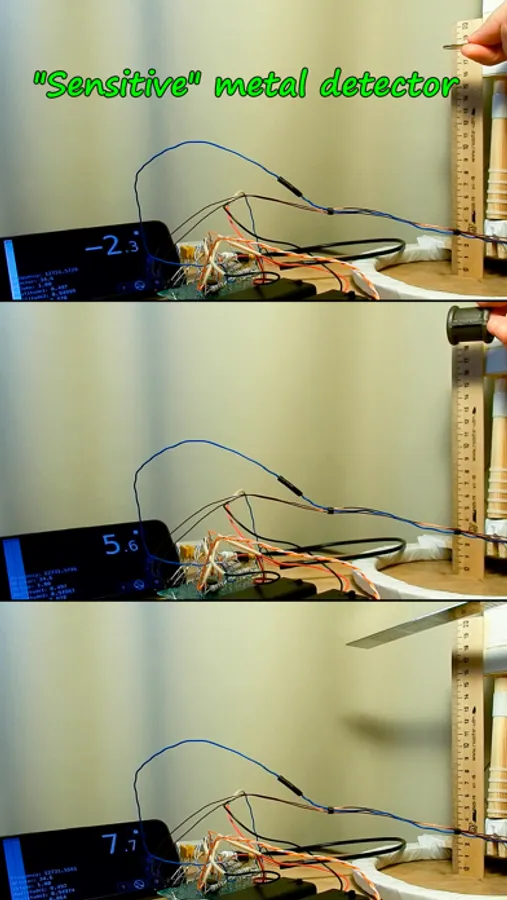 The main part of the device is the LC circuit. The stability of its parameters is very important. They constantly fluctuate with the slightest changes in temperature. Moreover, the inductance changes with the slightest changes in the geometry of the inductance coil. These changes are constantly being adjusted by the application. The parameters of the internal iPhone circuits and the headphone jack adapter can also fluctuate, but they stabilize after approximately 2-3 minutes after turning on the signal (therefore, the metal detector must work continuously during the search).