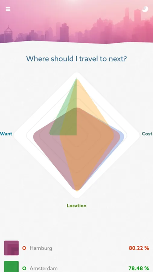 We are just a small endeavor from the tea and coffee filled Potsdam/Berlin, and this version is only a first step. In the FUTURE, we will also introduce UPCOMING features: Collaborative decision making, AI-based decision help and value suggestions, community feedback, long-term insights, social media integration… We are also continually improving the decision processes, of course.
