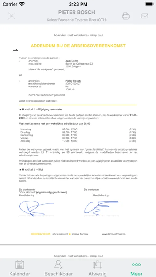 Aapi Me stelt je in staat om als werknemer van een horeca uitbater je kalender te bekijken, persoonlijke gegevens, je werkschema, contracten en meer.