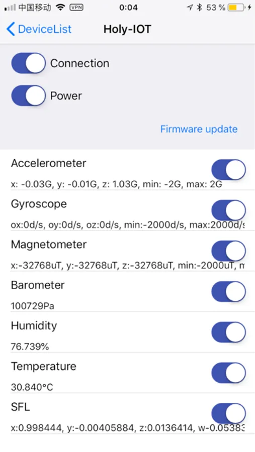You can connect your HolyIOT device in this application and check sensors values, like:
