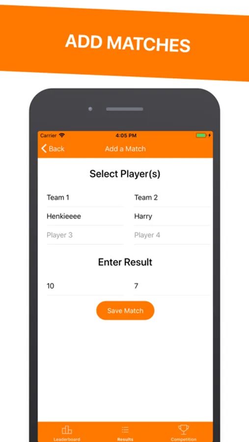 • Enter match results for 1v1, 1v2 and 2v2 matches.