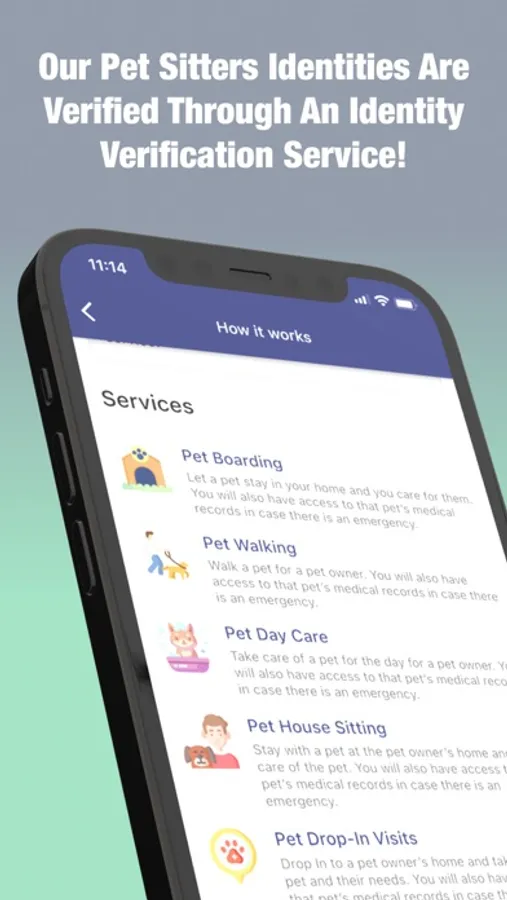The Pet Video Verify app lets you hire pet sitters for all types of pets, Dogs, Cats, Birds, Horses, Goats, Rabbits, Snakes, Hamsters, Mice, Ferrets, Cows, Pigs, or Donkeys! The sitters listed goes through an identity verification process to ensure the sitter’s identity. Schedule your pet sitting needs when you need it by searching through a number of local pet sitting service providers! Book and pay for the pet sitting services within the app. Chat with pet sitters within the app. Also, your pet sitter will have access to your pet’s medical records in case there is an emergency so they can share these records with emergency personnel! You can also become a pet sitter yourself and earn money by doing something you love!