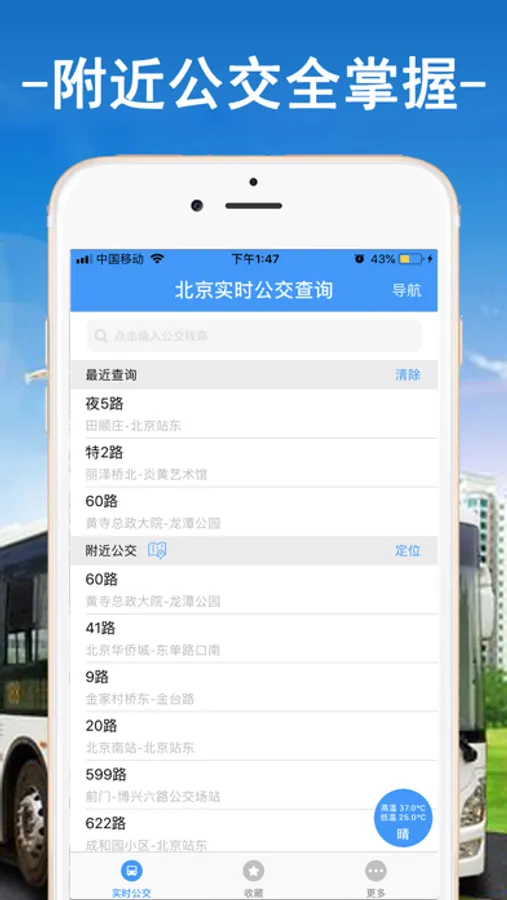 《北京实时公交》北京公交车实时查询利器,接入北京公交系统中心,精准定位公交车,公交到站时间实时更新,公交线路一目了然,北京市民众公交出行必备APP。
