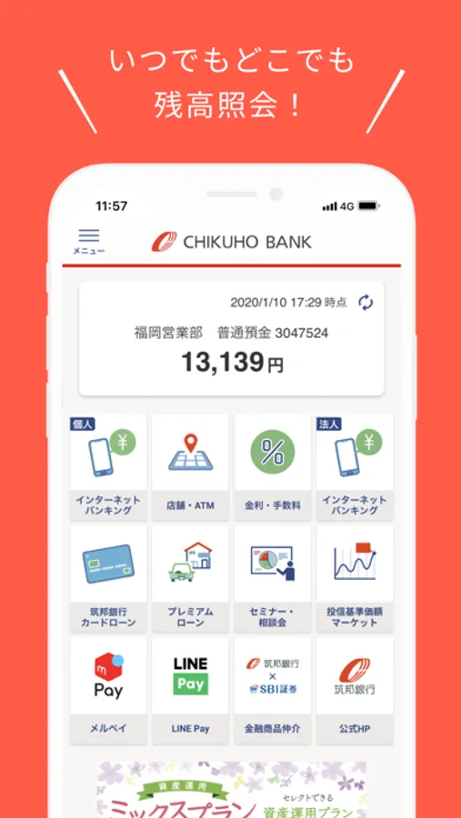 「ちくぎんアプリ」では、普通預金口座をお持ちの方は、インターネットバンキングの契約なしで、だれでも口座残高や入出金明細を確認できるほか、各種コンテンツへのリンクをご利用いただけます。まだ口座をお持ちでない方も、運転免許証をスマートフォンで撮影し、必要な情報とともに送信することで口座開設のお申し込みができます。