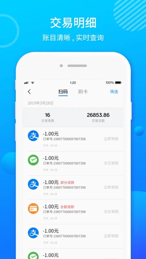 2、账目清晰。交易信息清晰透明,数据实时查询,收款自动语音播报。