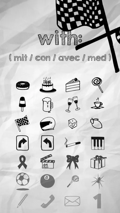 The set covers the following topics: Numbers (0-9), (Gate-)Letters (A-D, X), Airplane, Sweets, Lollipop, Donut, Cake, Birthday, Ice Cream, Beer, Wine, Clinking Glasses, Checkered Flag, Traffic Cone, Helmet, Cigarette, Cigar, Turning Street Sign, Light Bulb, Bow, Red Ribbon, Piano Keys, Music Notes, Popcorn, Clapperboard, Espresso, Present, Gift Box, Football, Tennis Ball, Tennis Racket, Paddle, Table Tennis Racket, Billiard Ball, Baseball, Basketball, Football, American Football, Fruits (Apple, Orange, Lemon, Strawberry, Grapes, Kiwi), Spider, Pencil, Pen, Phone, Letter (mail)