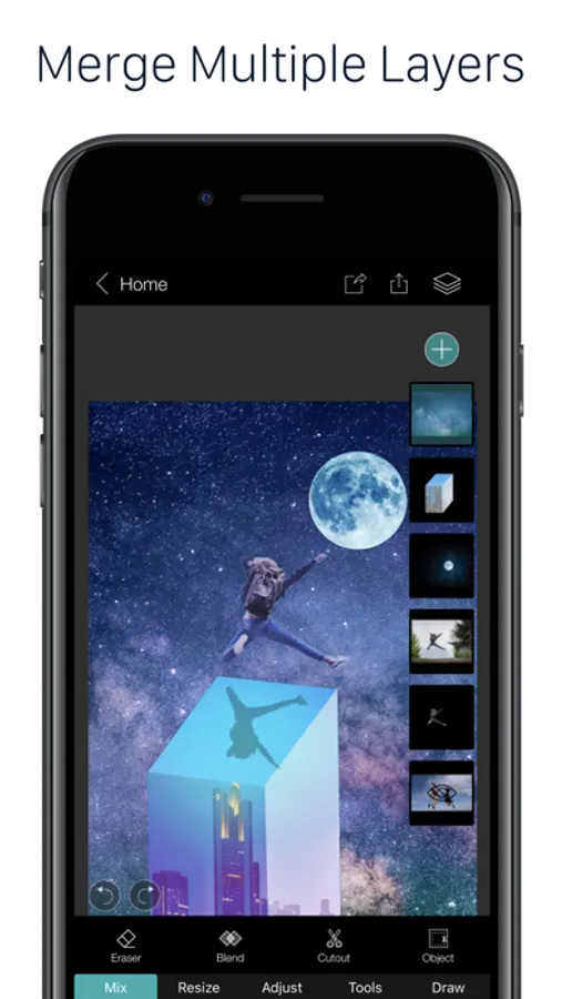 • Merge photos using different blend modes like darken blend, lighten blend to create double exposure, multiple exposure photo effects