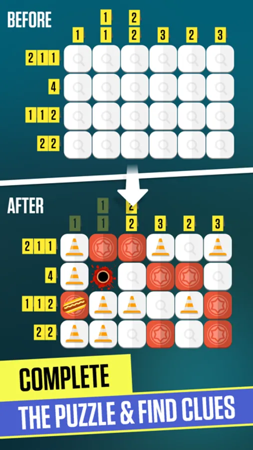 CRIMO's puzzles offer a fascinating cross-over between games of logic like sudoku and minesweeper, crosswords and criminal investigation board games. You will decode which squares to touch in the grid by following hints giving the sizes of blocks in each row and column. It’s a real mind challenge wrapped in a fun experience where you need to think and use your brains to succeed.