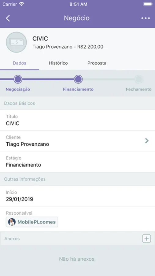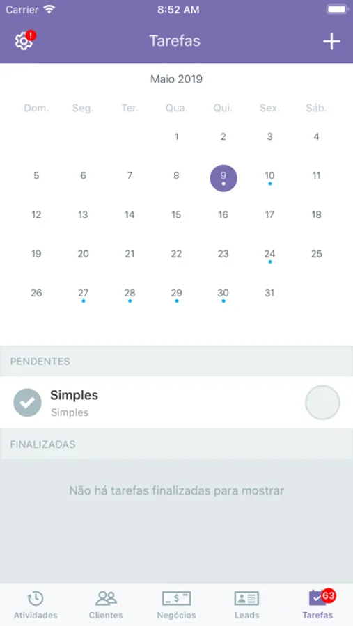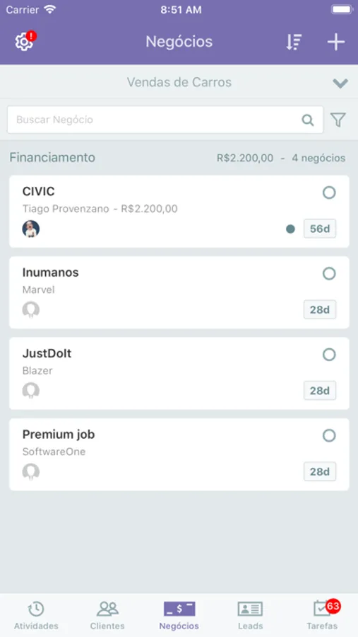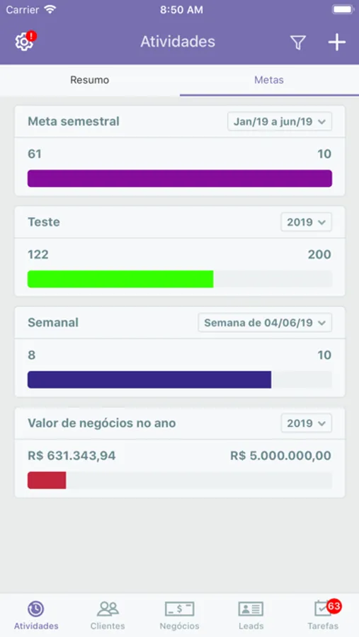 Acompanhe suas metas, sua lista de clientes, negócios e leads.
