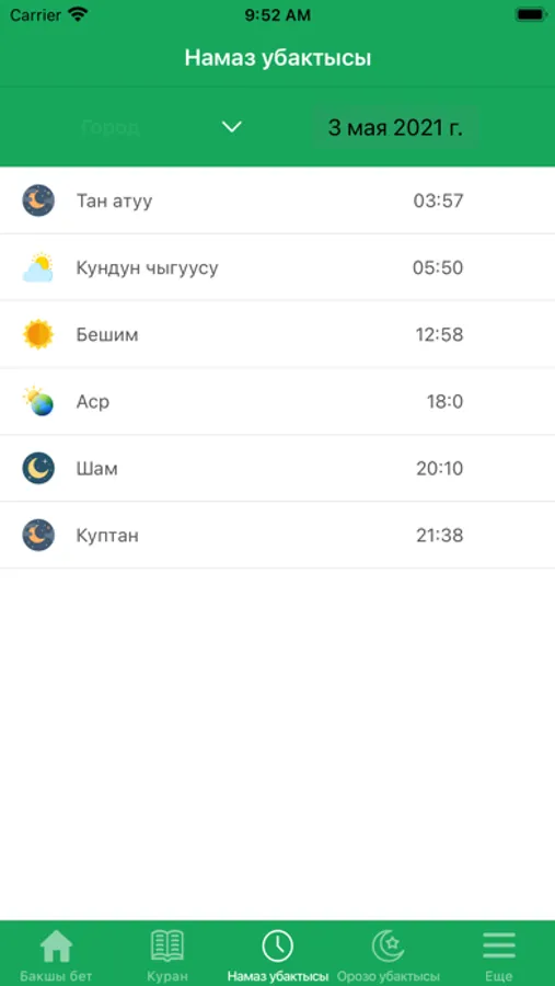 - Кыргызстан боюнча намаз убактысы (Бишкек, Ош, Балыкчы, Баткен, Жалал-Абад, Исфана, Каракол, Кызыл-Кыя, Нарын, Талас, Чаек)