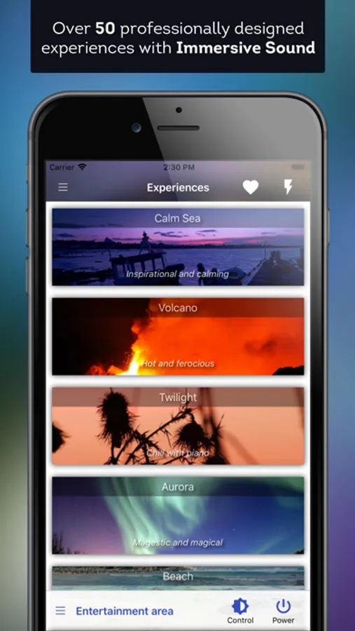 Feel energized or relaxed with professionally designed experiences combining light and sound. Over 50 mixable and dynamic scenes with simple room and lighting group control, such as mountain chill, fireplace, jungle night, fire and ice, rainforest, fireworks and many more!