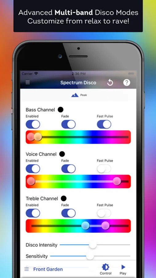 - Advanced sound to light DISCO modes (peak & spectrum) - Adjust response hue, strobe and much more!