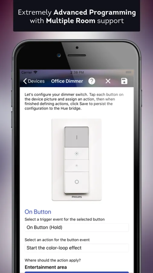 Make your Hue Dimmer, Tap, Lutron, RunLessWire and Niko devices more useful with our advanced programming interface, with more functionality that the official Philips Hue app. Unlock features such as multiple actions per button, toggle power with one button, cycle through ambiences, enable & disable color loop, cycle through brightness levels and much more!