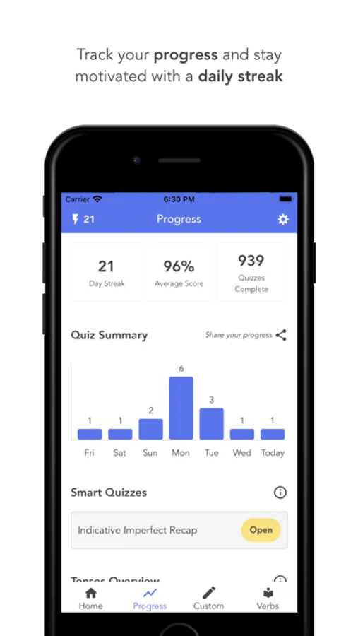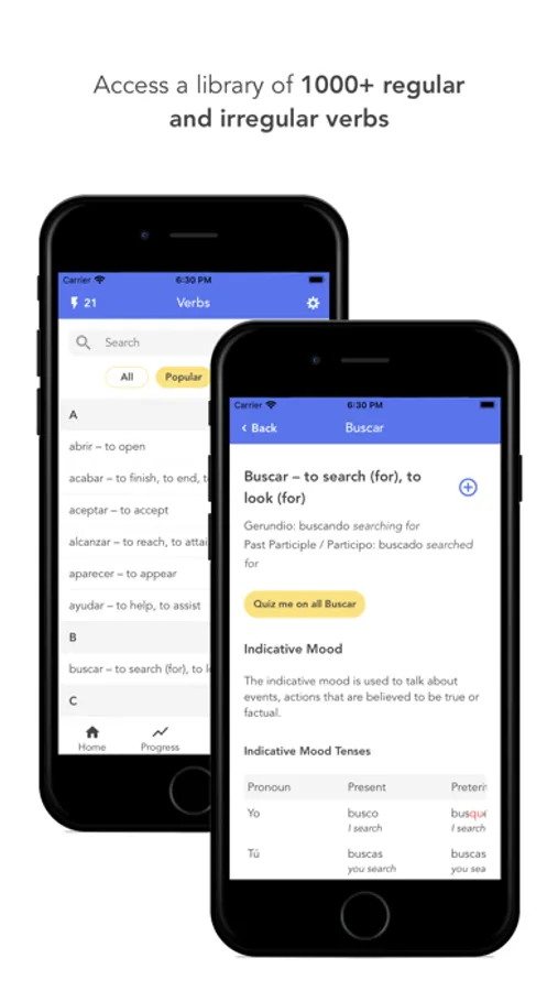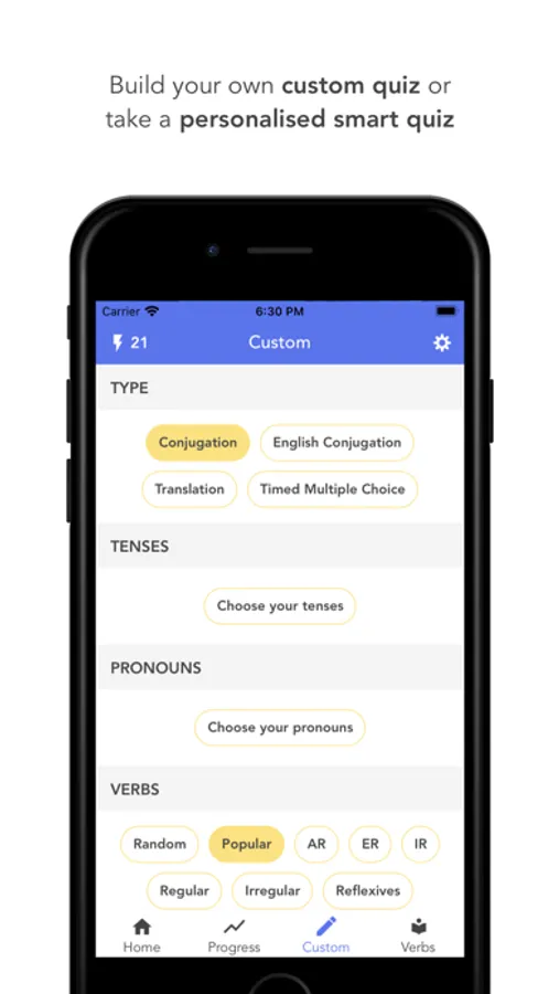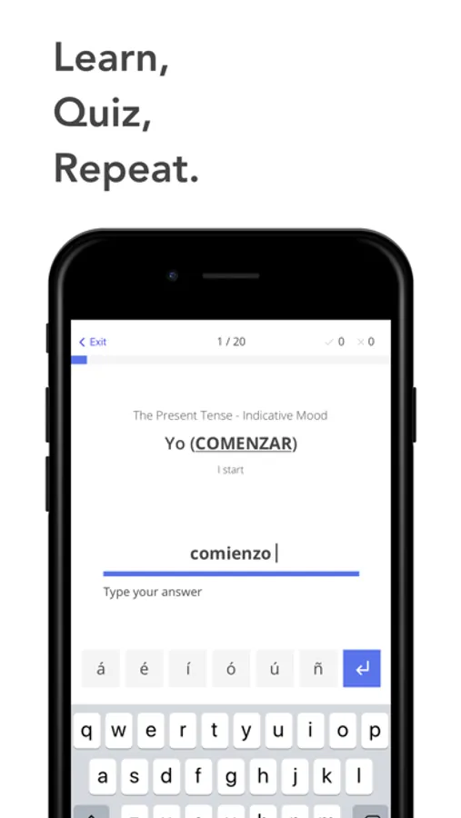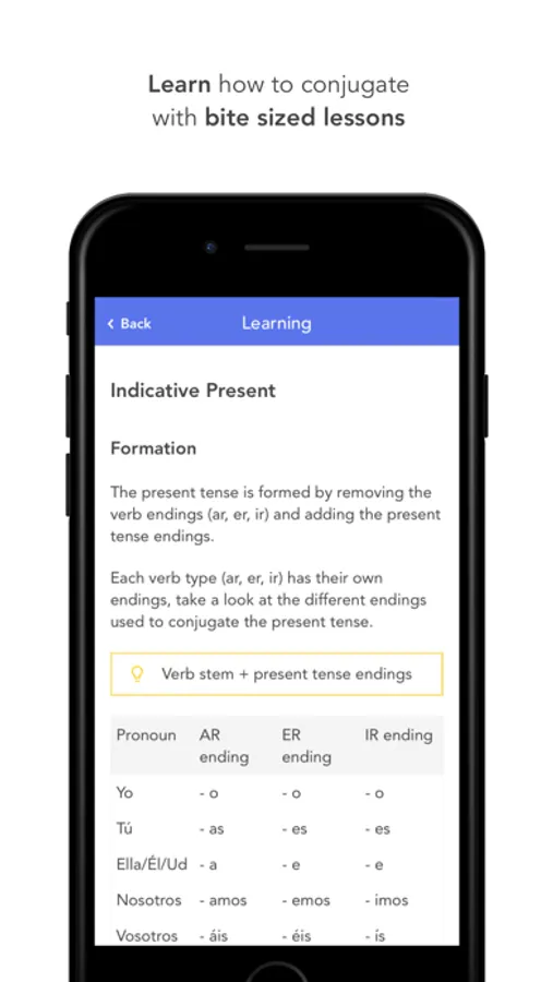 We aren’t your typical Spanish flashcards or verb trainer app. Our philosophy is “learn, quiz, repeat”. We teach you, then quiz you and then surface content again when you need it most. It’s been proven that quizzing helps with concentration, identifying gaps in knowledge and long term retention (Roediger & Karpicke, 2006). You’ll enjoy our personalized Smart Quizzes to help you improve your Spanish conjugation faster!