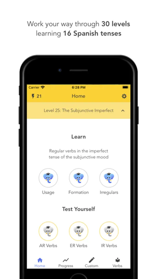- 30 levels (6 for free) with bite-sized lessons and quizzes guiding you through 16 tenses.