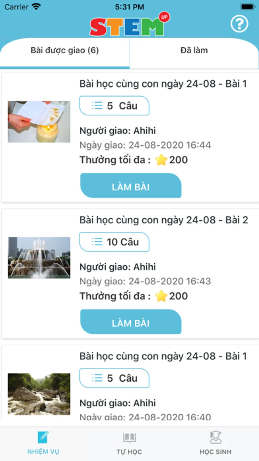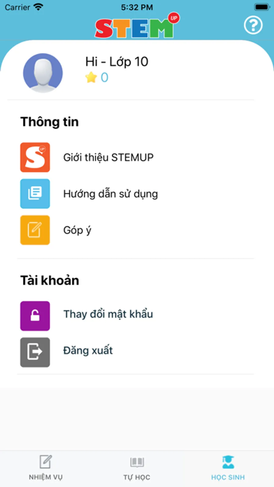 Ứng dụng hỗ trợ học sinh các cấp: tiểu học, trung học cơ sở, phổ thông trung học làm trắc nghiệm online. Phiên bản STEMUP Học Sinh.