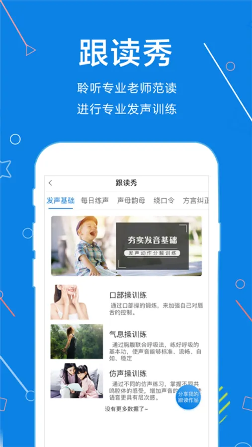 每日练声,从模仿跟读开始,声母韵母、绕口令、国学诗词、散文诗歌、新闻专题和广告宣传,全方位覆盖学习声音练习,跟读三天,进步看得见。
