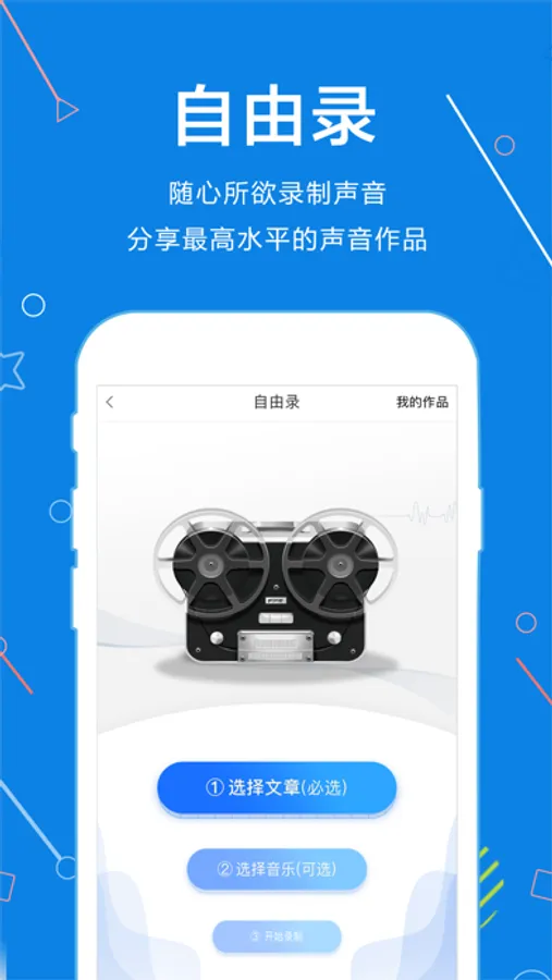 自由添加录制文章内容,自由添加背景音乐,充分体验随心所欲录制声音的感受,分享高水平的声音作品。