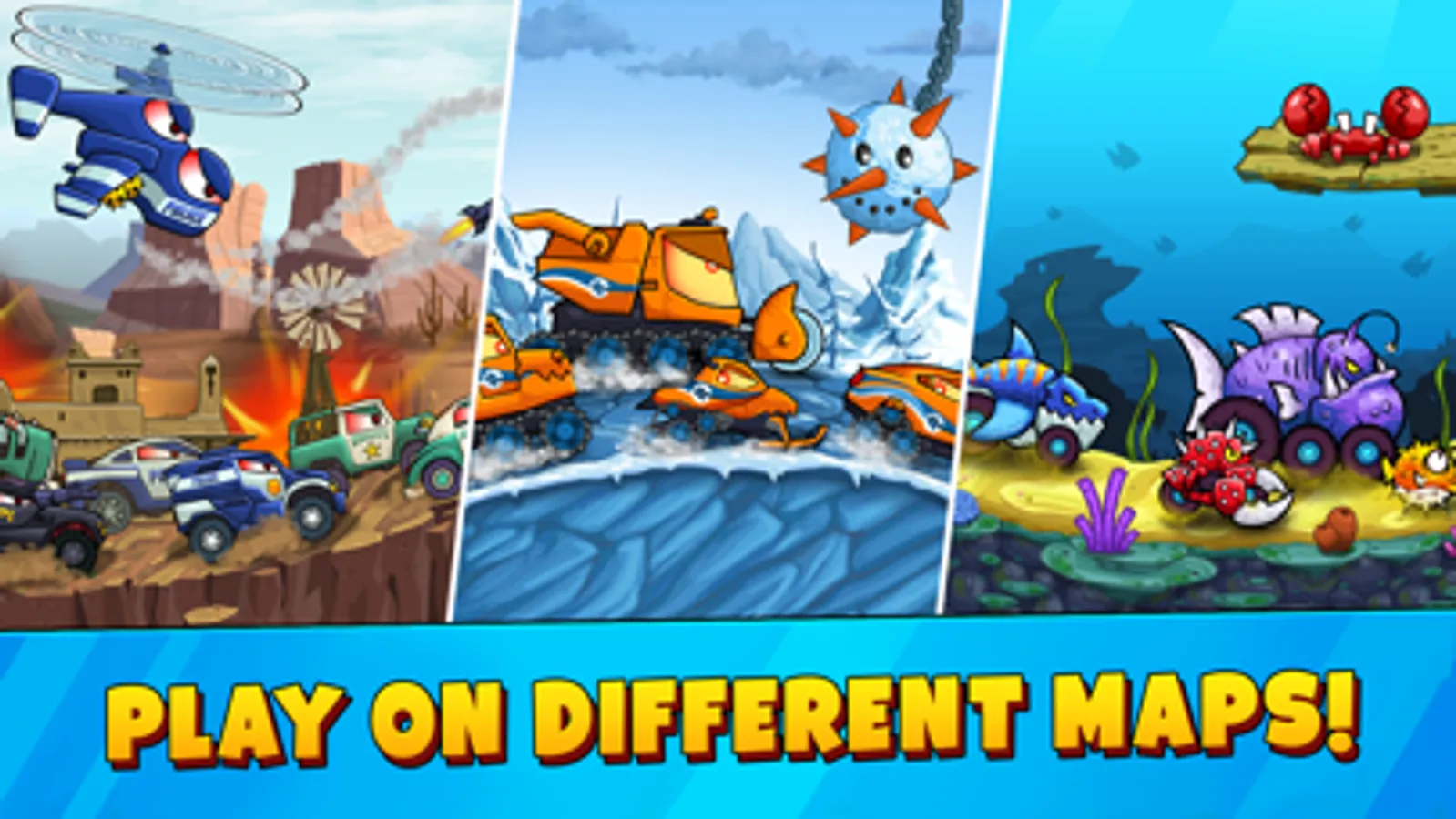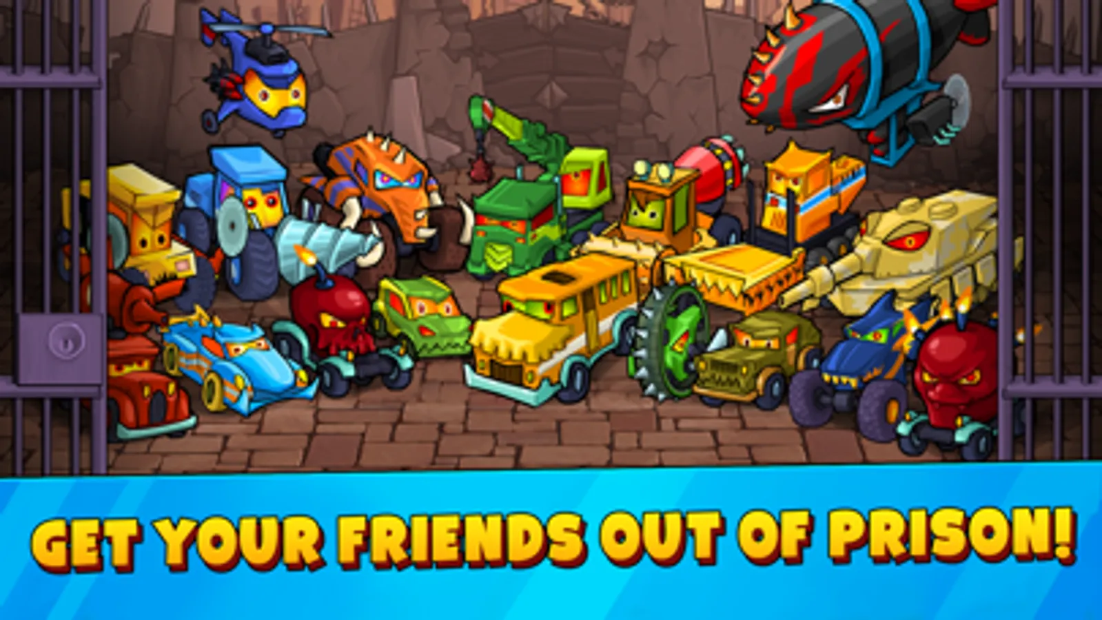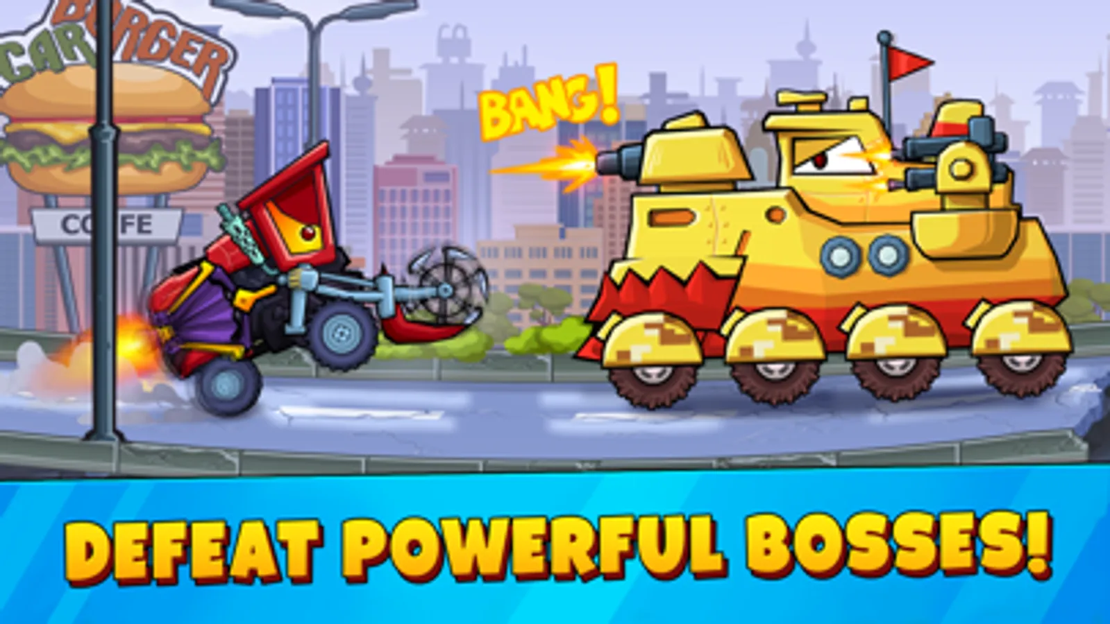 Drive the turbo boosted cars in a world of mobile racing action! Play online and offline with race vehicles such as red car “Beetlee”, tractor “Harvester”, battle vehicle “Loсomachine”, fast police racer “Francopstein” or tank driving machine “Tankominator”. Drive hill climb cartoon cars and start the turbo boosted engines in Car Eats Car 3!