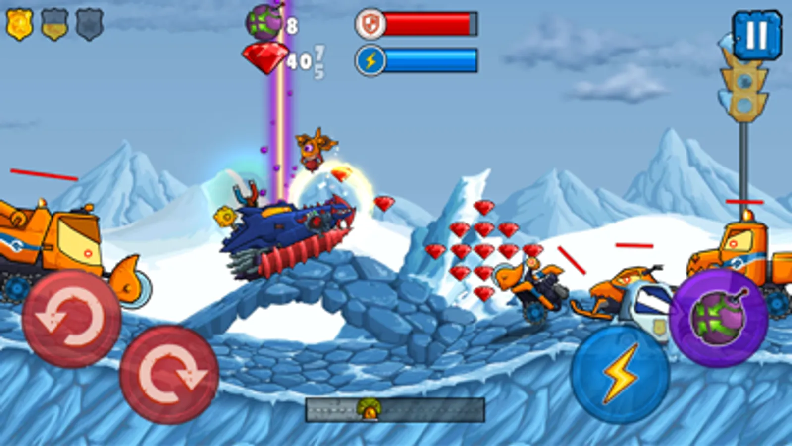 Pick the right vehicle for each level. Upgrade your car collection with turbo boost to stay ahead of the evil police. Many action battles are ahead of you in this 2D race game.