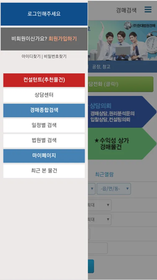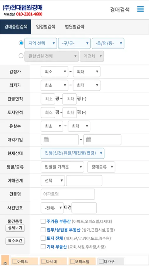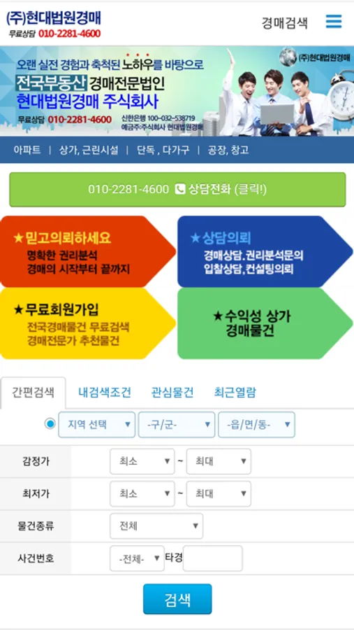 부동산 법원경매,전국법원경매,대법원경매,아파트경매,빌라경매,단독주택경매,공장경매,상가경매,토지경매 물건검색을 핸드폰으로 간편하게 검색할 수 있으며 무료상담 가능합니다.