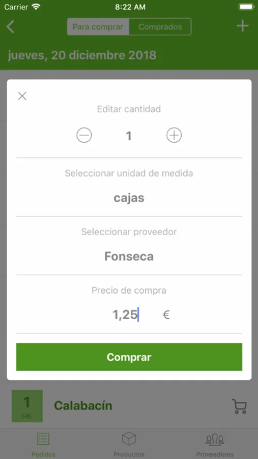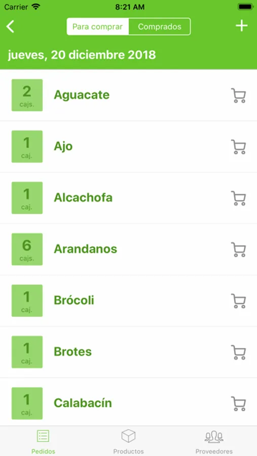 A la hora de crear un nuevo pedido indicaras la fecha en la que realizaras la compra o bien la fecha en la que esperas su recepción. Un vez vayas comprando los artículos de tu pedido los podrás ir marcando en la aplicación y podrás ver claramente que productos te faltan por comprar. Además dejaras registrada la información del proveedor donde hiciste la compra y el precio al que lo adquiriste, de este modo, podrás llevar también un control de la evolución de los precios de tus productos.