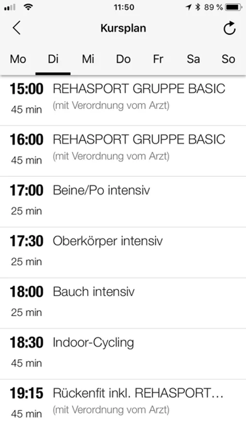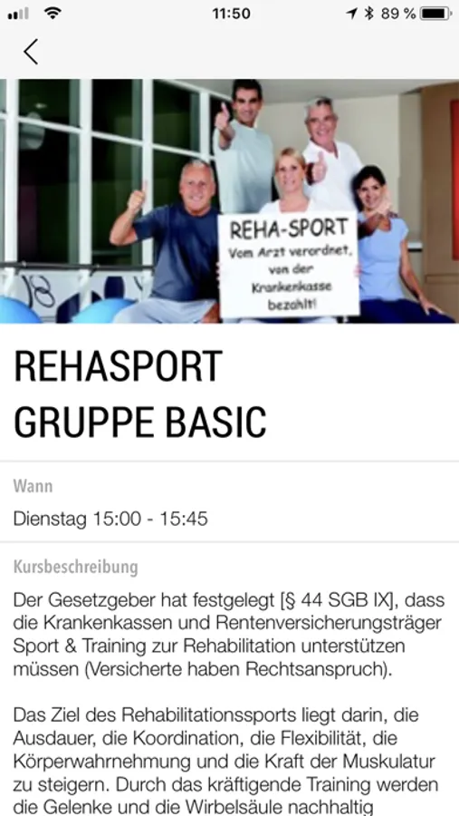 Direkter und aktueller Zugriff auf den Kursplan von überall: Für jeden Kurs kannst Du Details wie Zeit, Kursbeschreibung, Raum und Merkmale wie z.B. den Schwierigkeitsgrad einsehen.