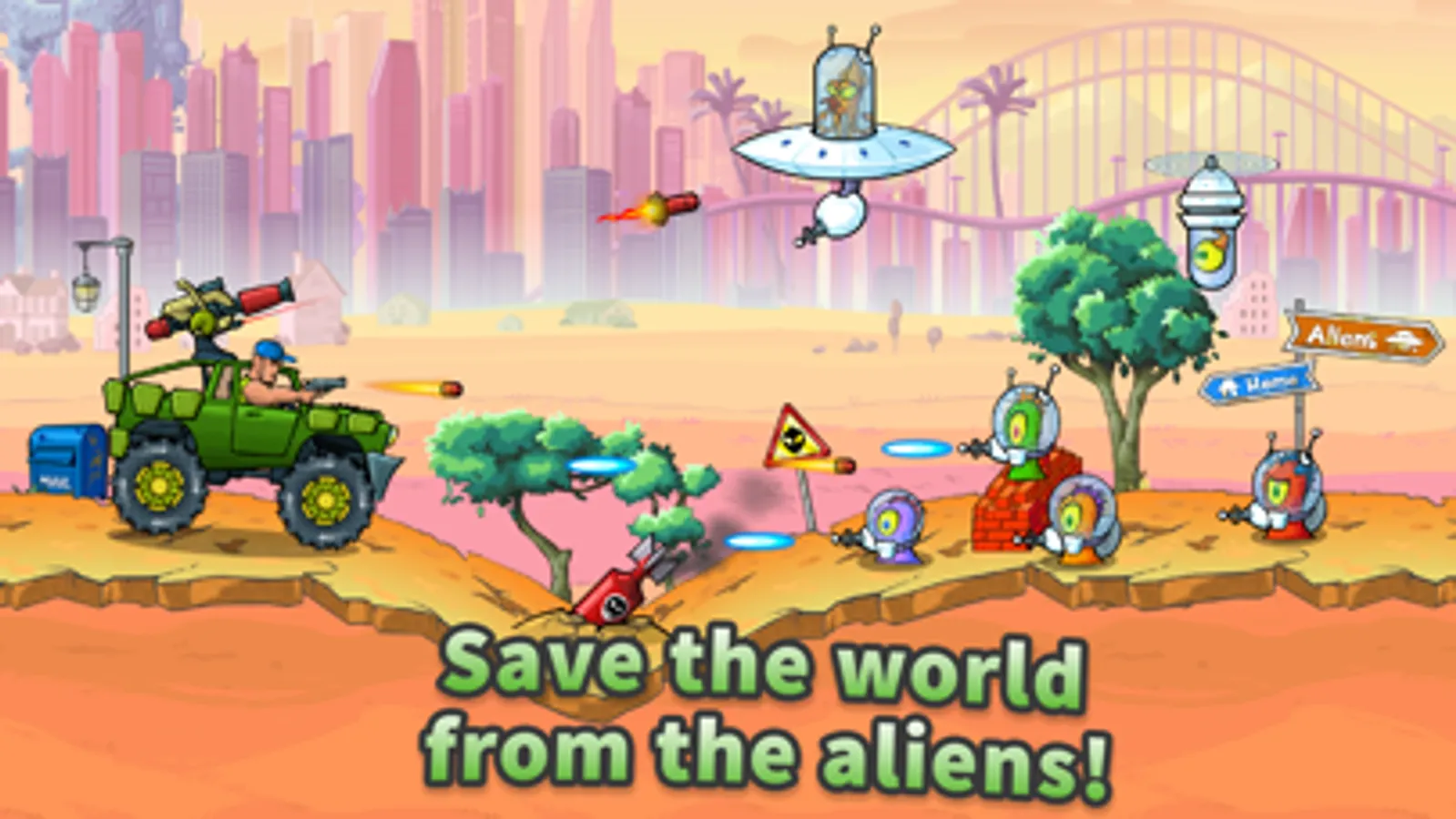 Ride, shoot, jump and smash your way to victory in this addictive runner. Team up with ex-Marine Bob to battle evil aliens who have invaded the planet. To make things even worse, they’ve kidnapped his beloved pet octopus. Needless to say that Bob is on a mission to make this an encounter that the aliens won’t soon forget!
