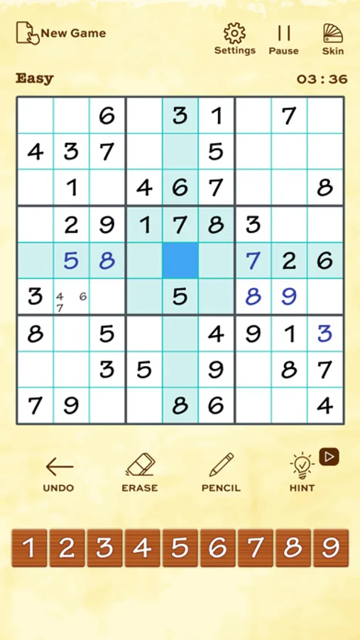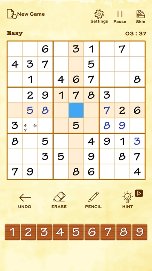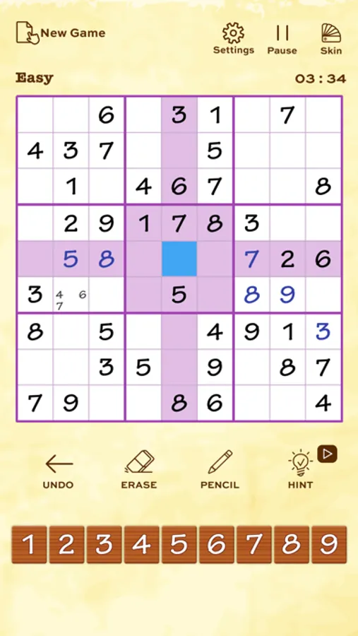 5. Features that can help: pause the game whenever you need; undo and erasing are allowed; use the pencil to note possible numbers in the cell; Use hints when stuck.
