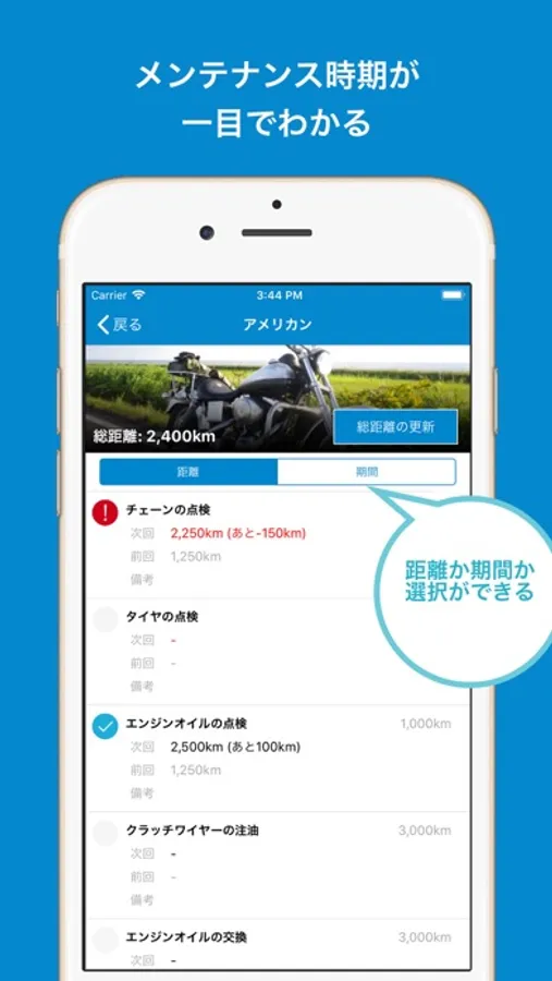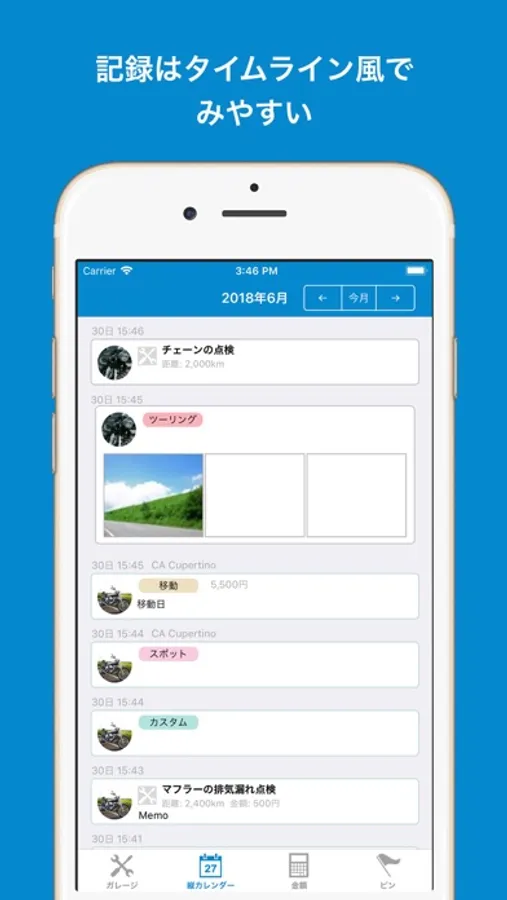 バイクのメンテナンスや、ツーリングなどの日記を記録できるアプリです。