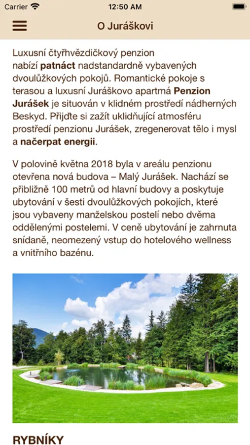 Aplikace Penzion Jurášek nabízí důležité informace o penzionu. Naleznete v ní informace o penzionu, novinky z penzionu či kalendář nadcházejících akcí. V aplikaci najdete také tipy na aktivity v okolí penzionu, fotogalerii nebo třeba přehledný ceník. Aplikace poskytuje rychlé volání, snadné psaní e-mailu, snadnou navigaci a důležité odkazy.
