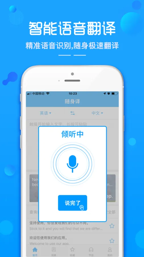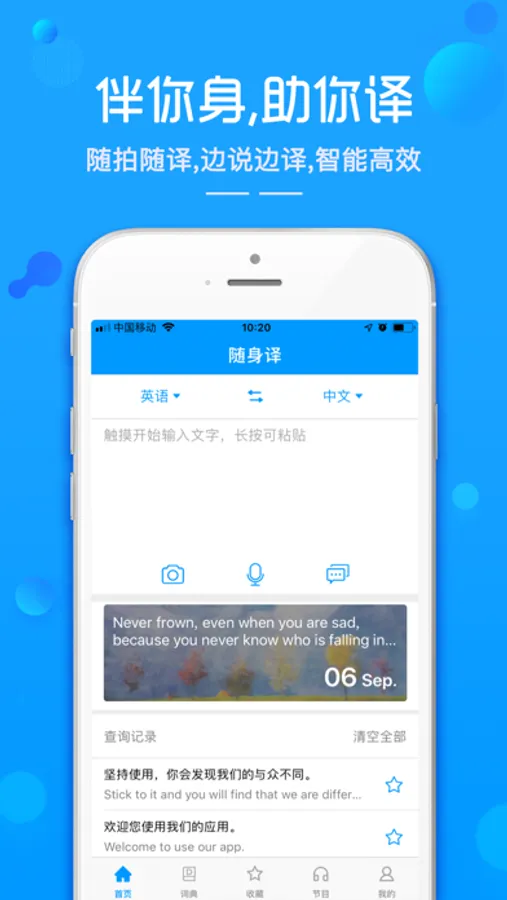 《随身译》一款随身智能翻译软件,依托人工智能技术,精准拍照翻译,智能语音翻译,支持300+语种,特色随身听外语节目,出国旅行外语学习随身必备!