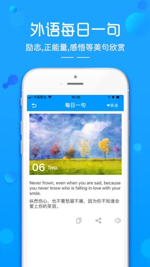 2,每日一句,励志、哲理、名人名言等,除了句意解释外,还有投稿人对美句的意境详解哦!