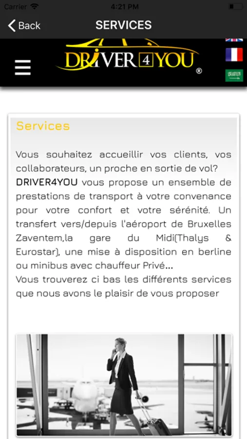 DRIVER4YOU est une solution de transport qui vous propose différentes formules de location de Voiture et de Minivan avec Chauffeur Privé à Bruxelles, ainsi qu'un service limousine de qualité en fonction de vos besoins pour les entreprises et particuliers, qu'il s'agisse d'un transfert vers/depuis les aéroports, shuttle, pick up vers et depuis les Hôtels, Gares ,d'une mise à disposition avec chauffeur privé, ou d'un Evénement ou Mariage.