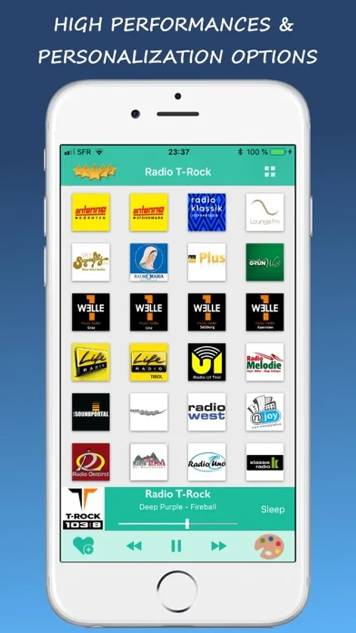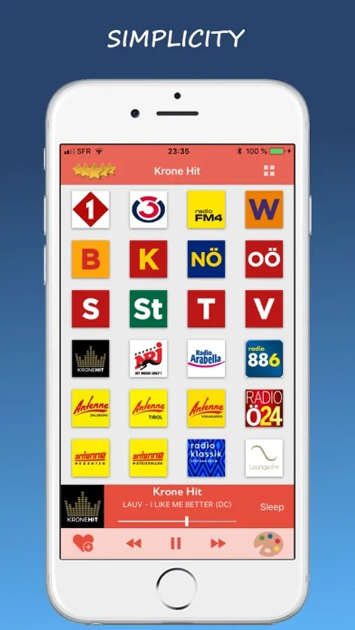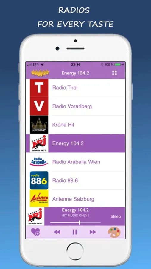 A user-friendly interface which allows you to get to the essentials quickly: enjoy listening radio. This simple, yet powerful, interface is also customizable! We give users the opportunity to choose the display mode (list or grid) and the colour of the theme. And in the favourites menu, you can also change the order of the stations or hide some stations.
